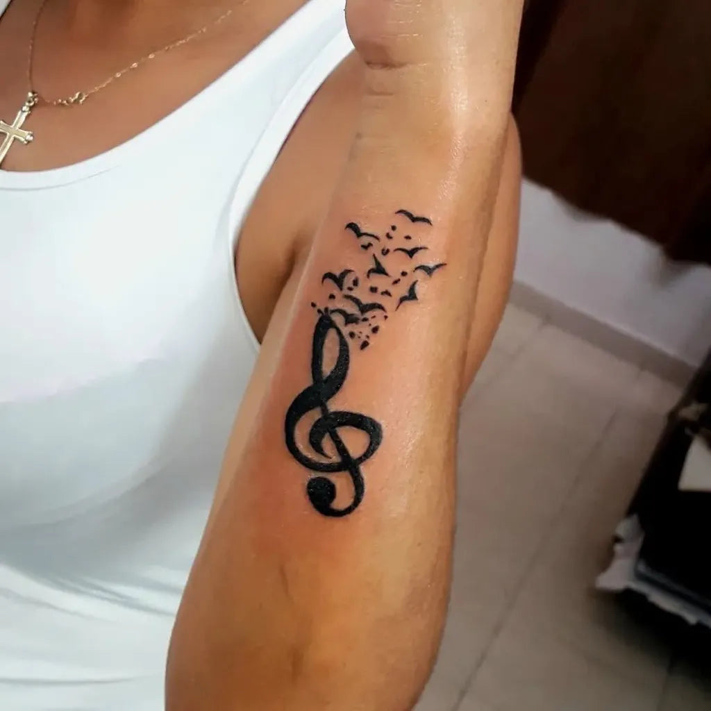 Small Blackwork Treble Clef and Birds Music Tattoo on Women Arm by @inkbybruno