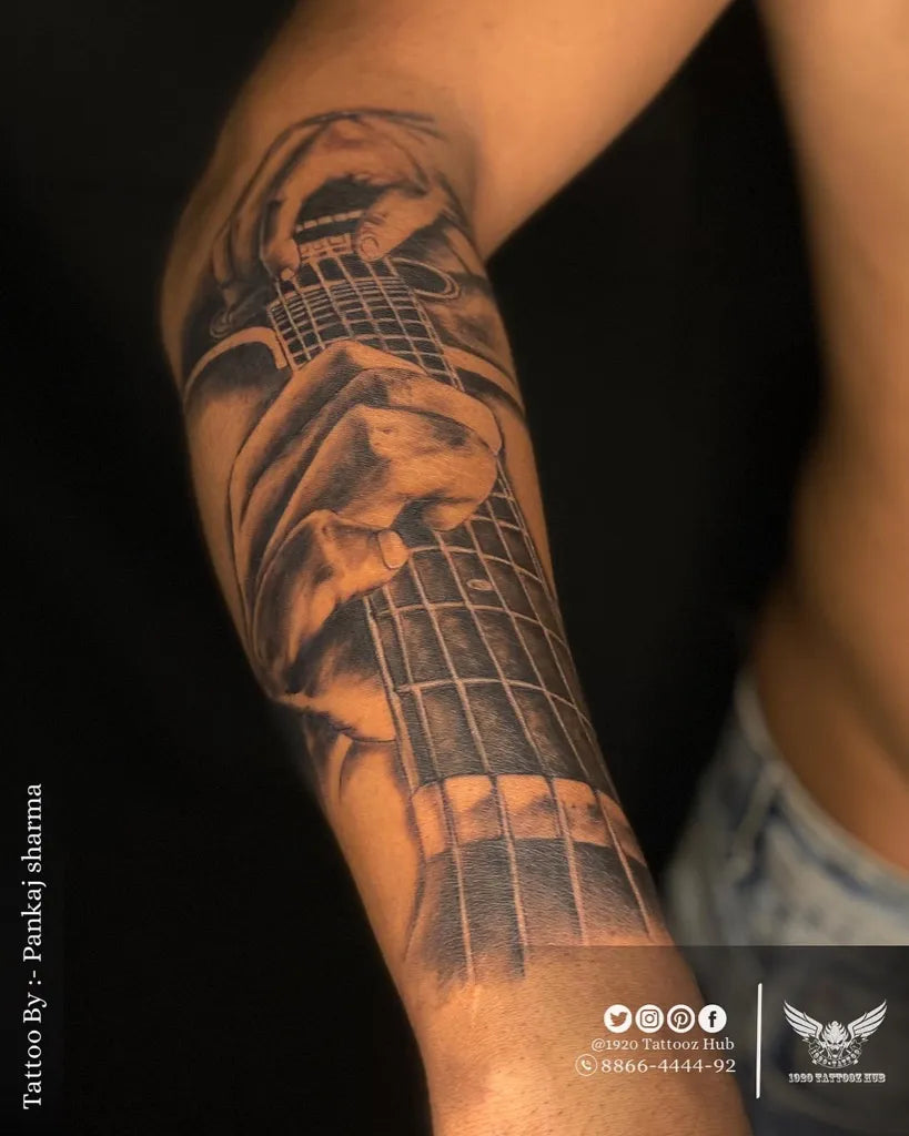 Medium Black and Grey Guitar Music Tattoo on Men Arm by @arts_creation_tattoo_studio