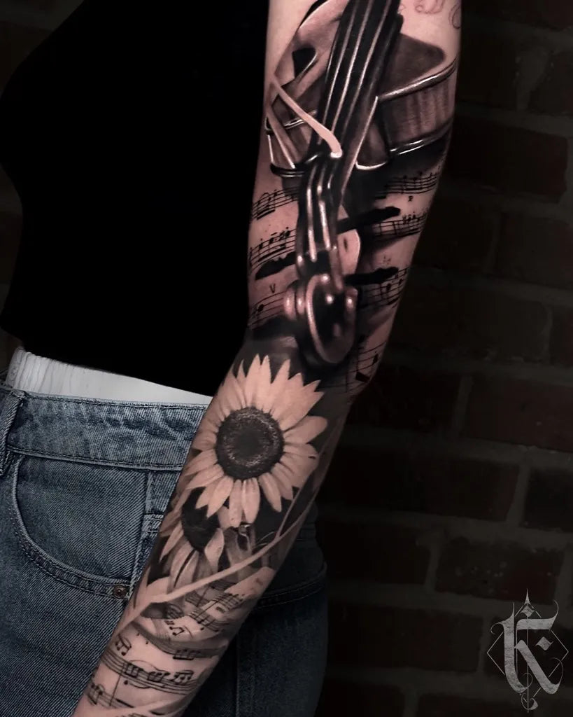 Big Black and Grey Violin and Sunflower Music Tattoo on Women Arm by @kubaty.tattoo