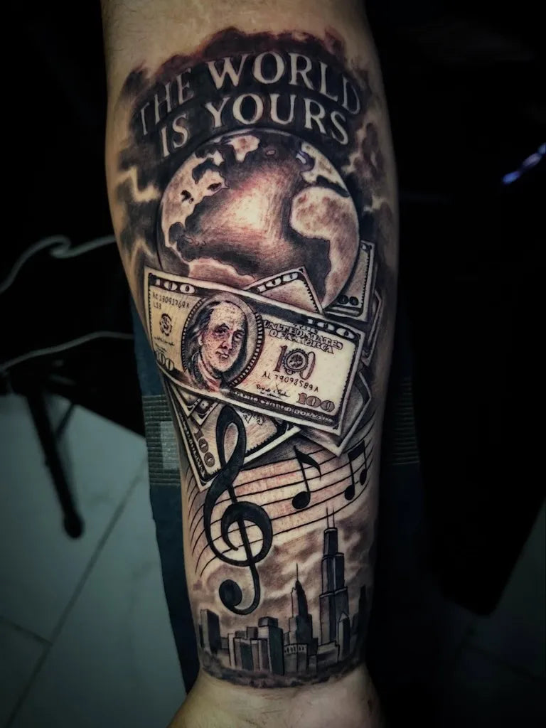 Big Black and Grey World Money Music Tattoo on Men Arm by @triplej_tattoos