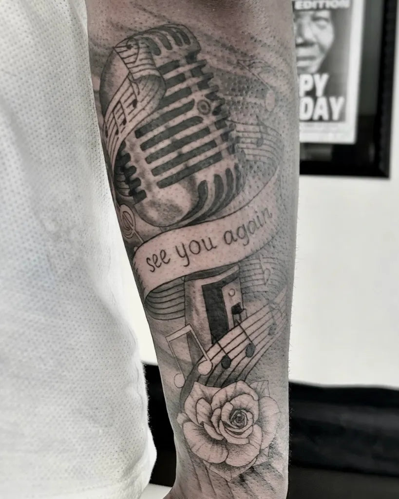 Medium Black and Grey Microphone Rose Banner Music Tattoo on Men Arm by @annamillertattoo