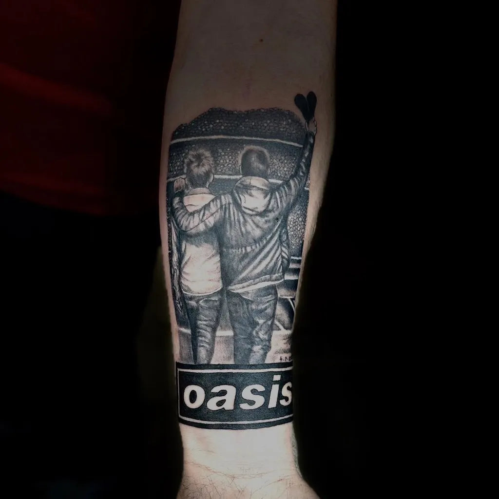 Medium Black and Grey Oasis Band Music Tattoo on Men Arm by @tattoos_by_jake_llewellyn