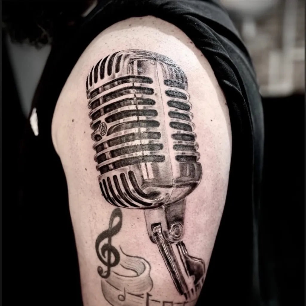 Big Black and Grey Portrait and Microphone Music Tattoo on Men Arm by @hugoink_bristol