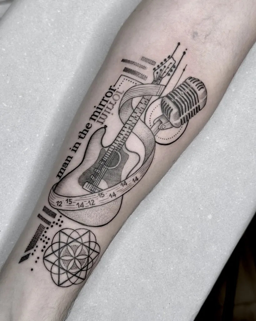 Medium Blackwork Guitar Microphone Ribbon Music Tattoo on Men Forearm by @primaiatattoo