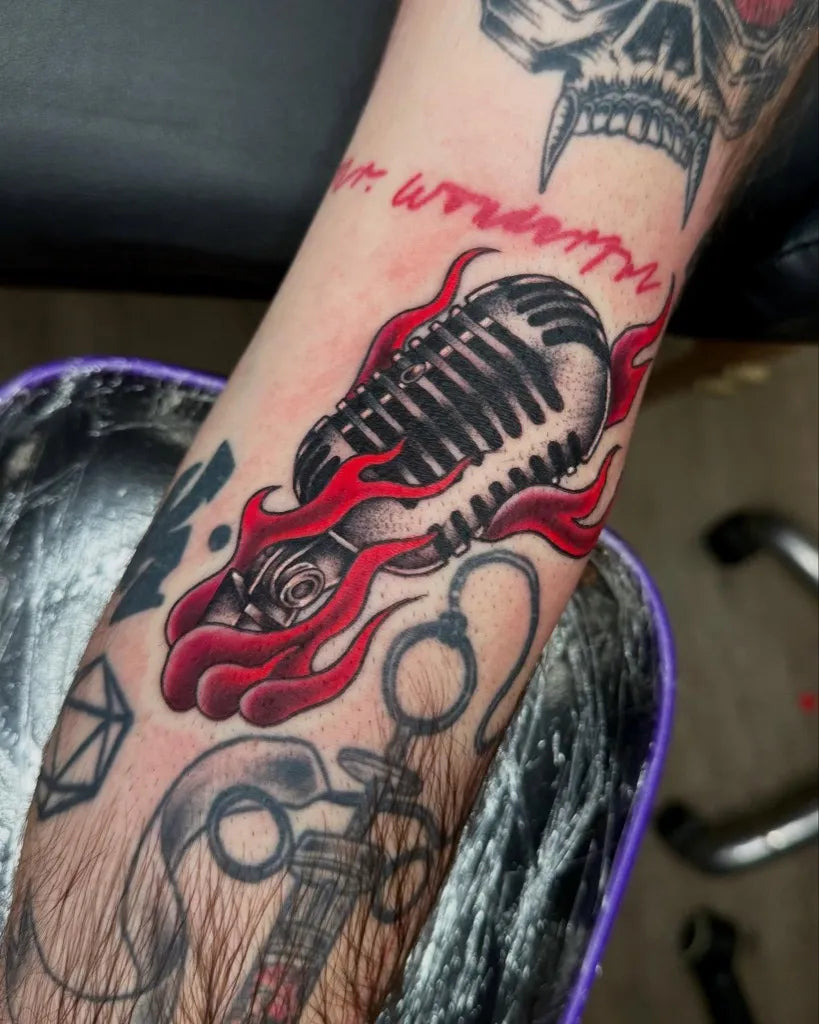 Medium Blackwork Microphone Fire Tattoo on Men Arm by @emilycolgantattoos