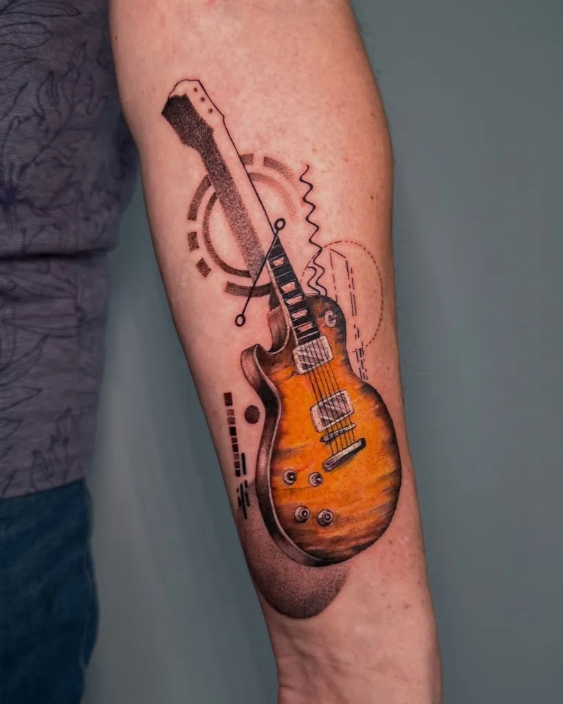 Medium Neo Traditional Gibson Guitar Music Tattoo on Men Arm by @szelmatattoo_wro