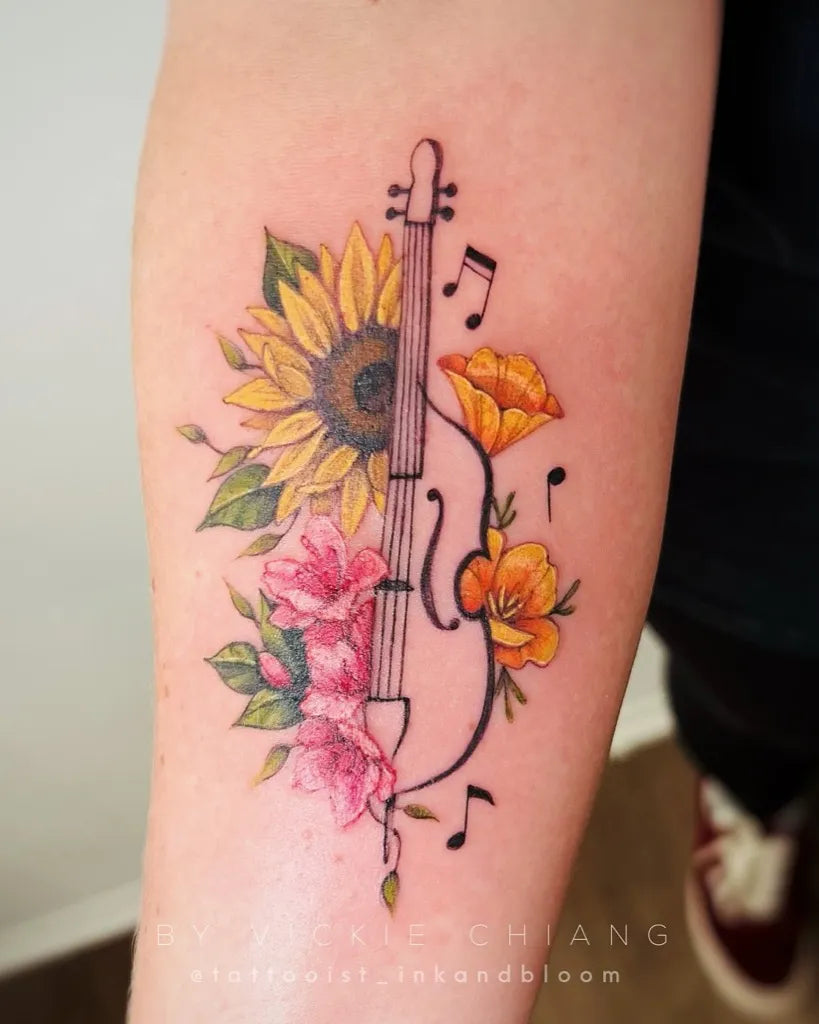 Medium Neo Traditional Violin Sunflower Peony Music Tattoo on Women Arm by @tattooist_inkandbloom