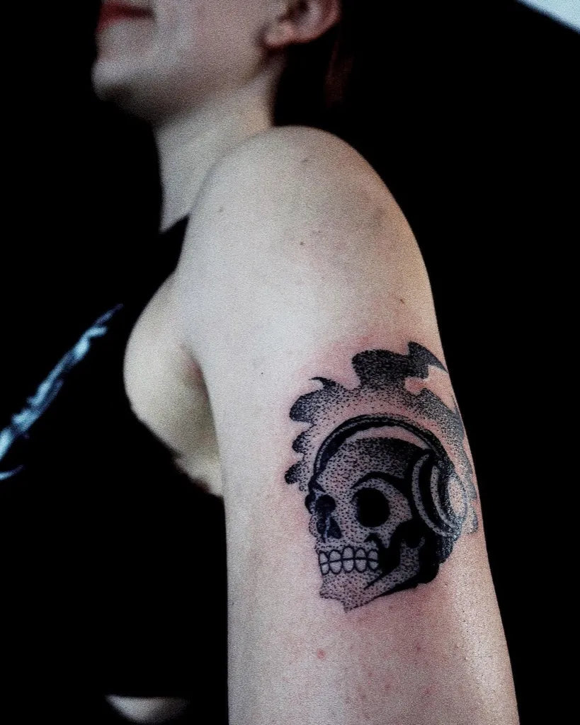 Small Blackwork Skull with Headphones Music Tattoo on Women Shoulder by @feelings_boi