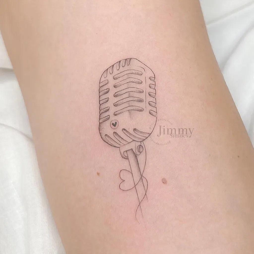 Small Fine Line Microphone with Heart and Name Music Tattoo on Women Forearm by @souljimmytattoo