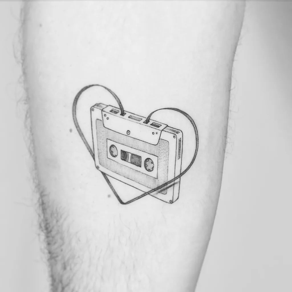 Small Linework Cassette Heart Music Tattoo on Men Thigh by @finelinetattooantwerpen