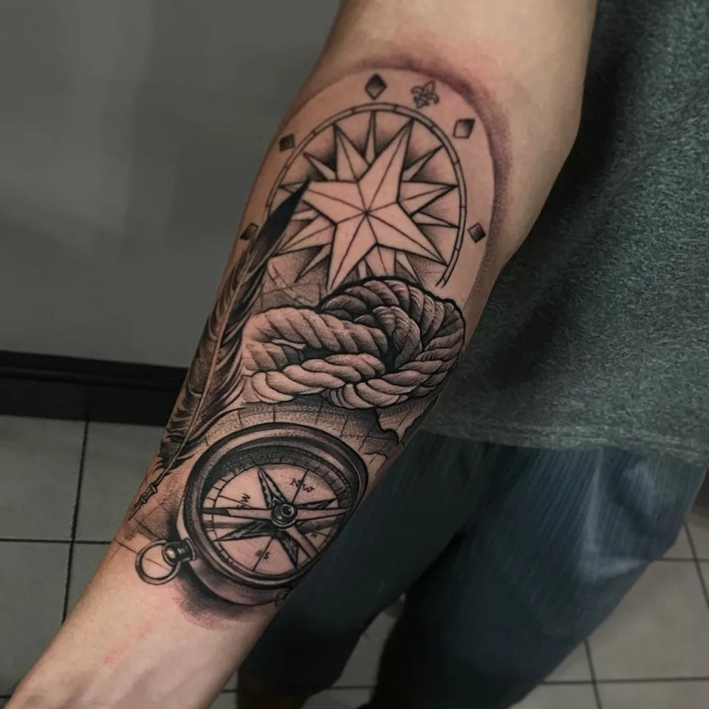 Big Black and Grey Compass Rope Feather Nautical Tattoo on Men Arm by @cris_element