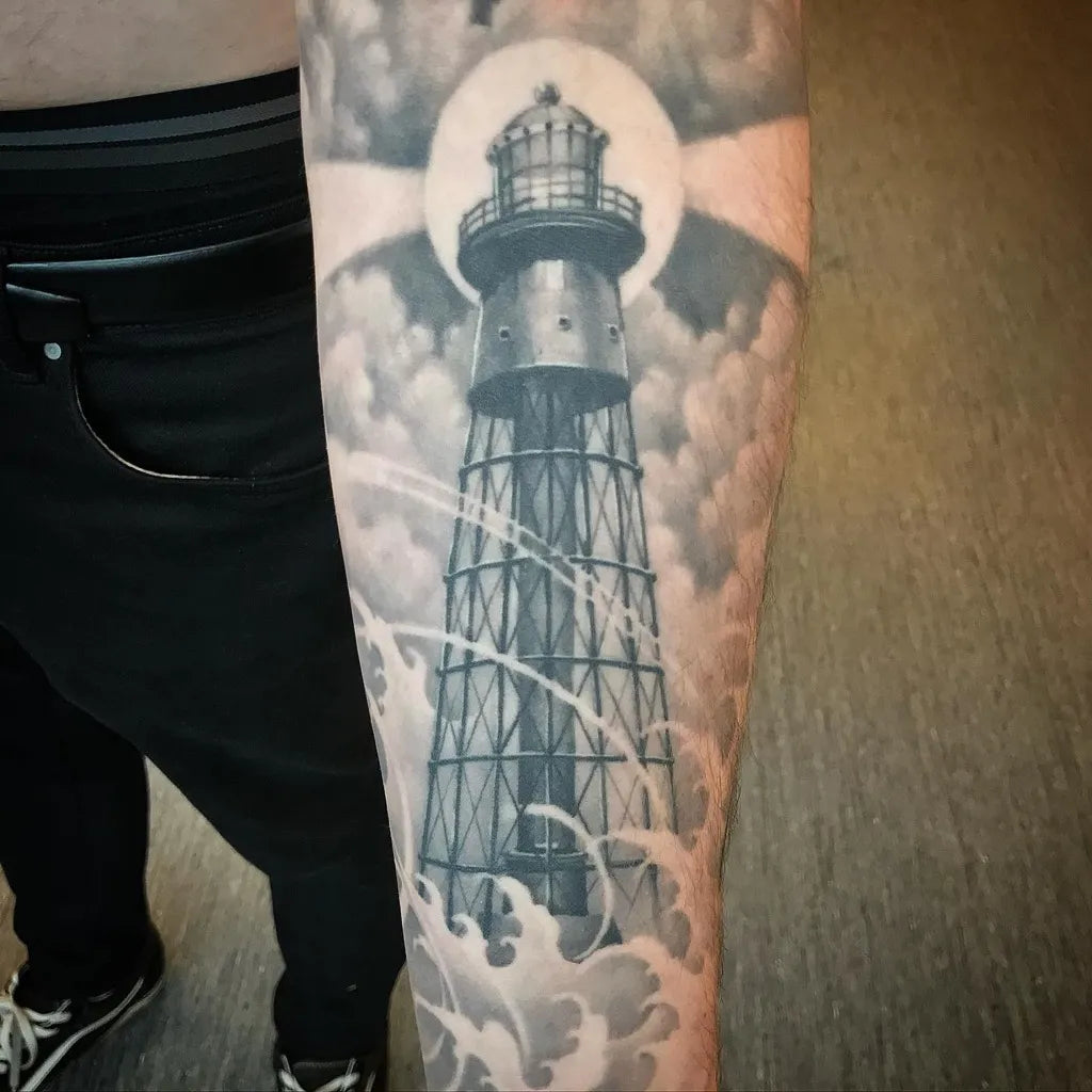 Big Black and Grey Lighthouse and Clouds Nautical Tattoo on Men Arm by @petterpusher