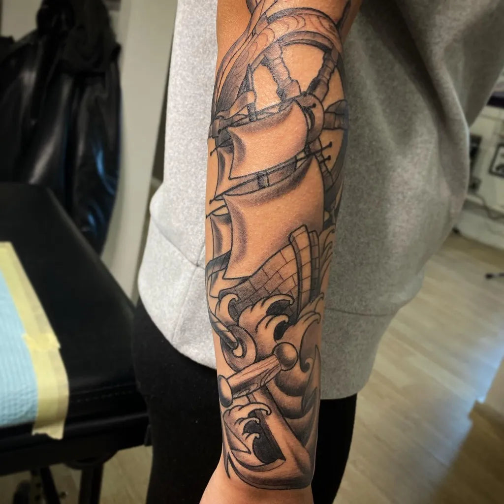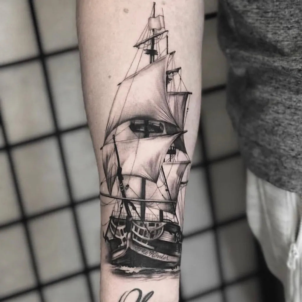 Big Black and Grey Sailing Ship Tattoo on Men Arm by @irezumi.parlor