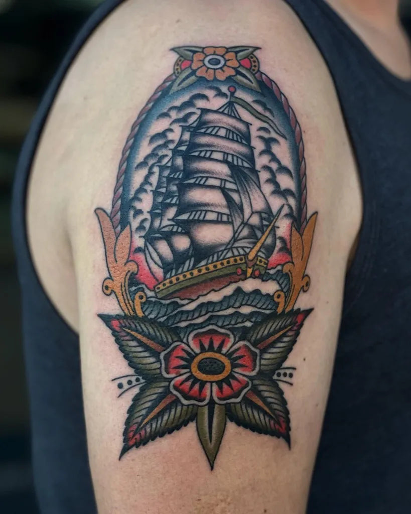 Medium American Traditional Sailing Ship Flowers Nautical Tattoo on Men Arm by @alexduquettetattoos