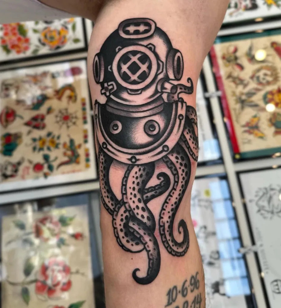 Medium Blackwork Diving Helmet and Octopus Nautical Tattoo on Men Upper Arm by @hardtravelinmayne