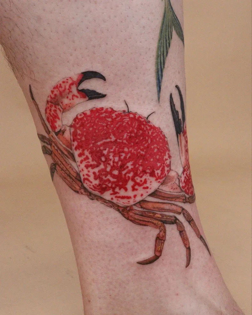 Medium Realism Red Crab Tattoo on Women Leg by @aliceink_tattoos
