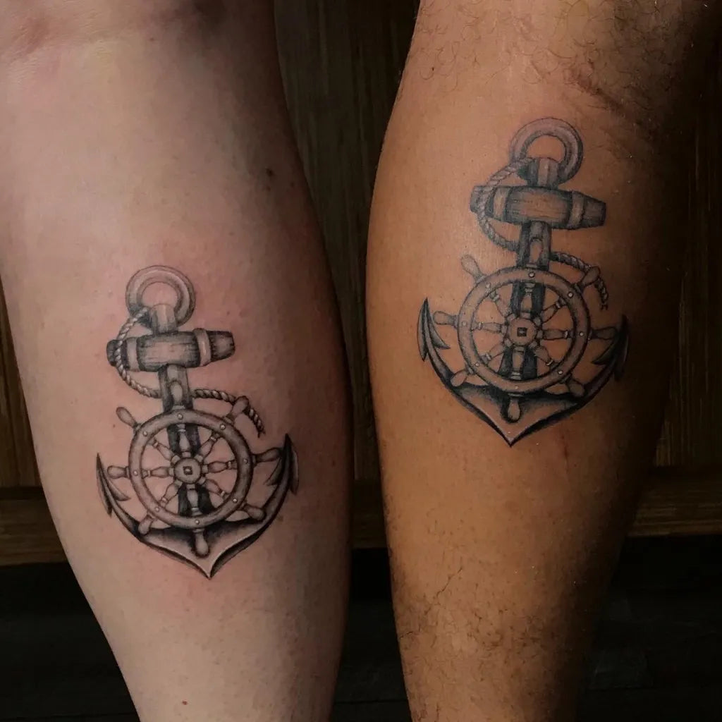 Small Black and Grey Anchor and Wheel Nautical Tattoo on Women Leg by @melbootstattoo