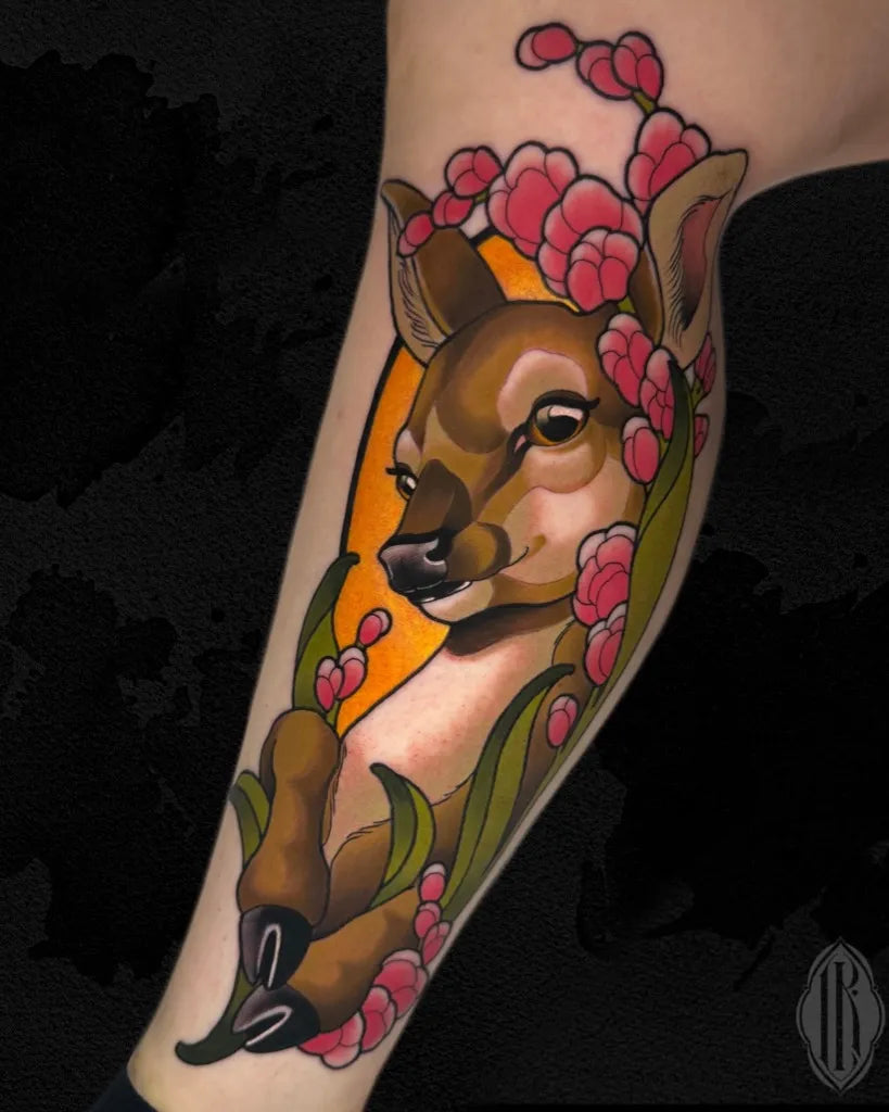 Big Neo Traditional Deer with Flowers on Women Thigh Tattoo by @lukaskaytattoo