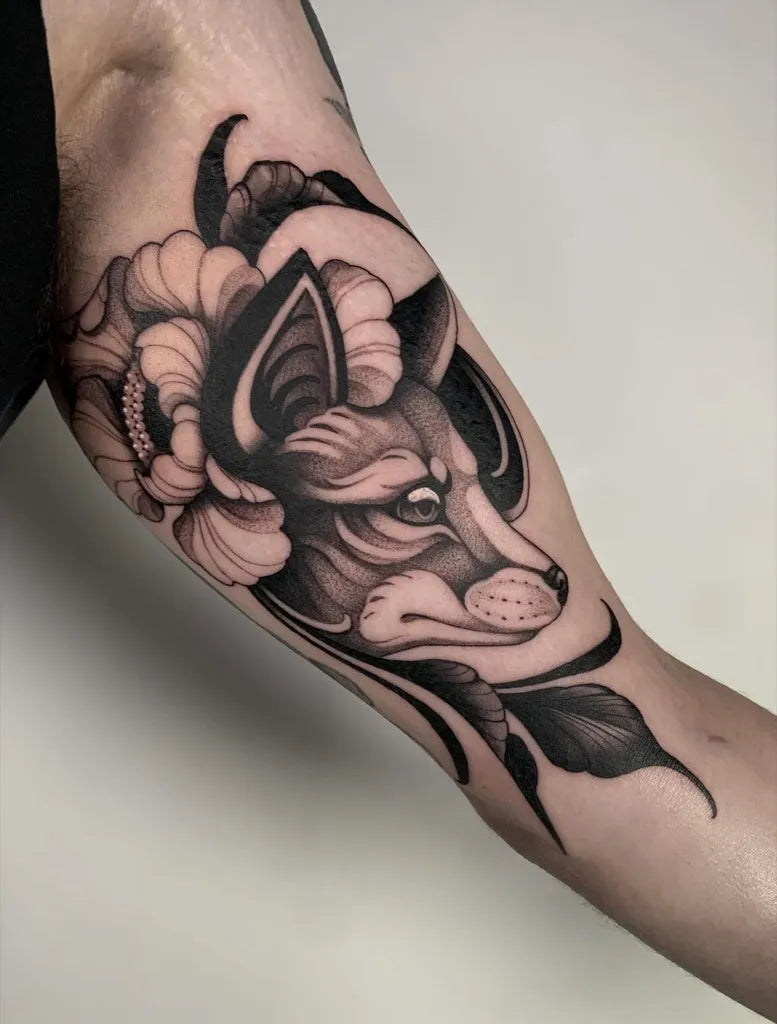 Big Neo Traditional Fox and Peony on Men Upper Arm Tattoo by @mollyissketchy