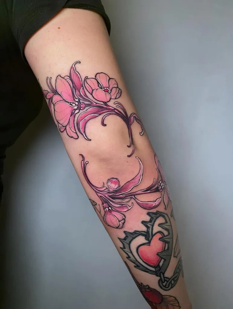 Big Neo Traditional Pink Lilies and Heart on Women Arm Tattoo by @corderosimona