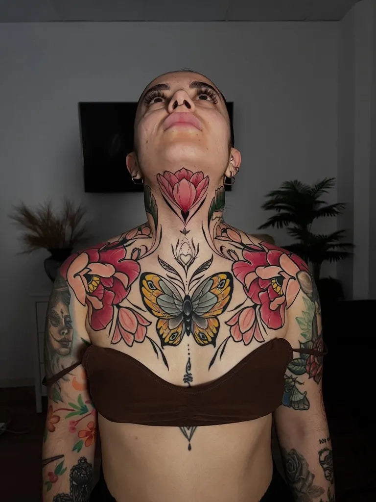 Big Neo Traditional Lotus Butterfly Roses on Women Neck and Chest Tattoo by @daniel13tattoo