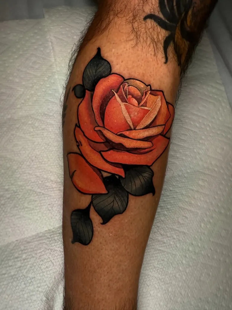 Big Neo Traditional Red Rose with Black Leaves on Men Leg Tattoo by @travisbrown918