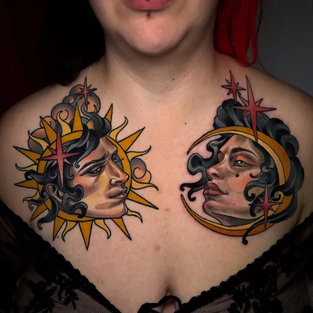 Big Neo Traditional Sun and Moon on Women Chest Tattoo by @renelle_tattoo