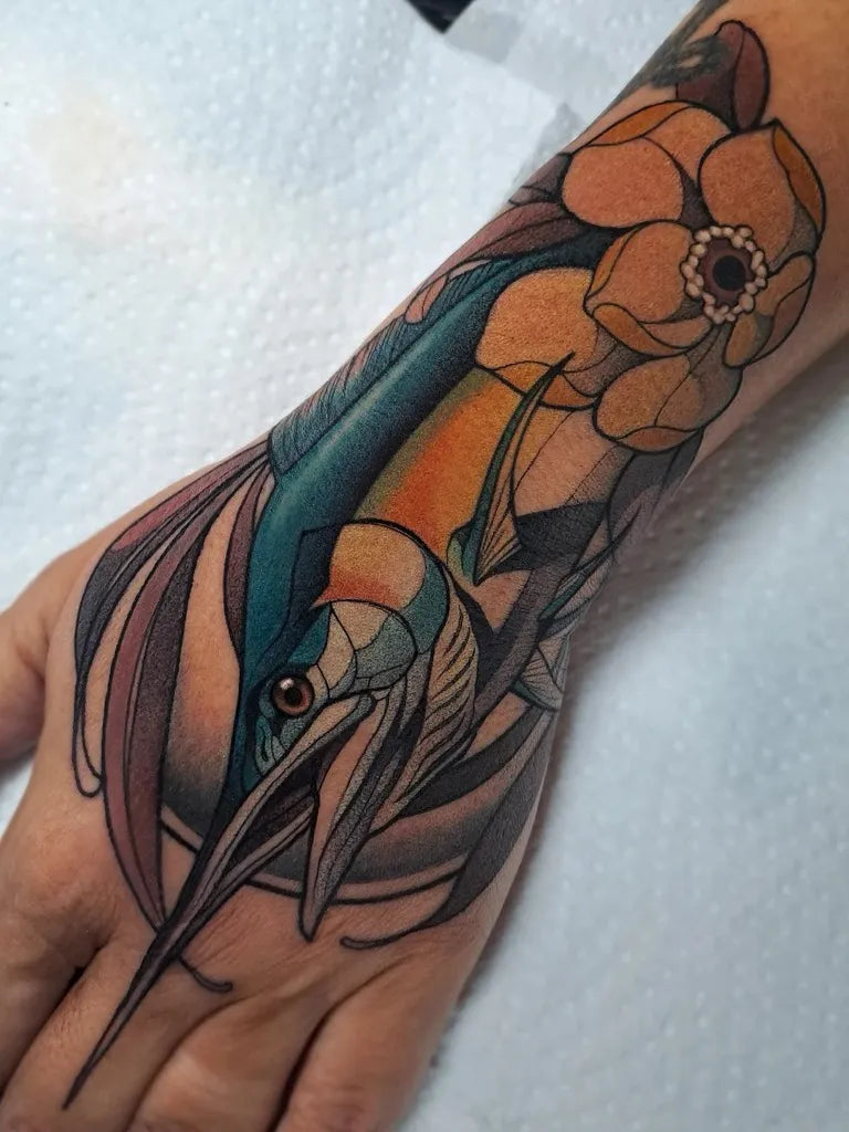 Big Neo Traditional Swordfish and Flowers on Women Wrist Tattoo by @kbn.sensibilitey