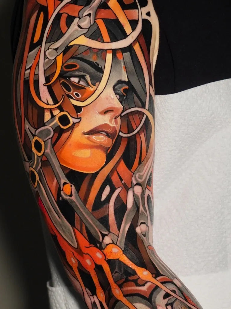Big Neo Traditional Woman with Mechanical Hair and Chains on Women Arm Tattoo by @jeanpaulmaratt