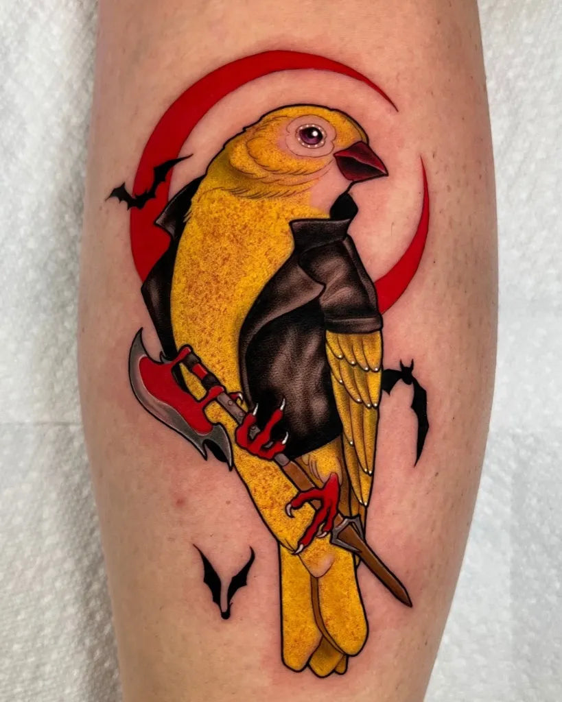 Big Neo Traditional Yellow Canary with Axe and Bats on Women Leg Tattoo by @chughestattoos
