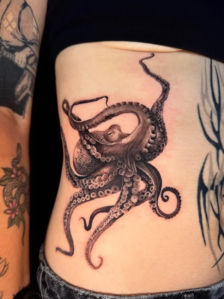 Big Black and Grey Octopus Tattoo on Women Torso by @tat.it.too