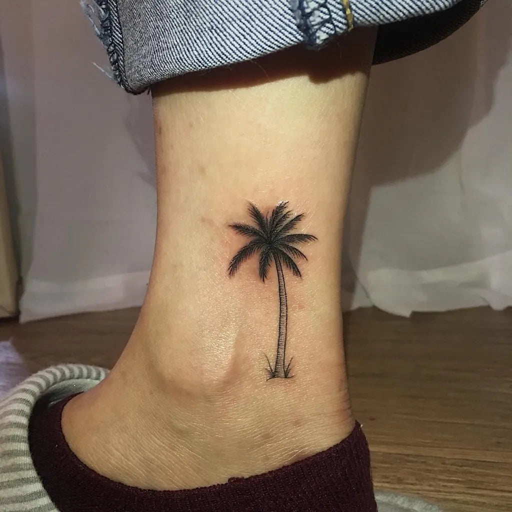 Small Minimalist Palm Tree Tattoo on Women Ankle by @szymon_radzik