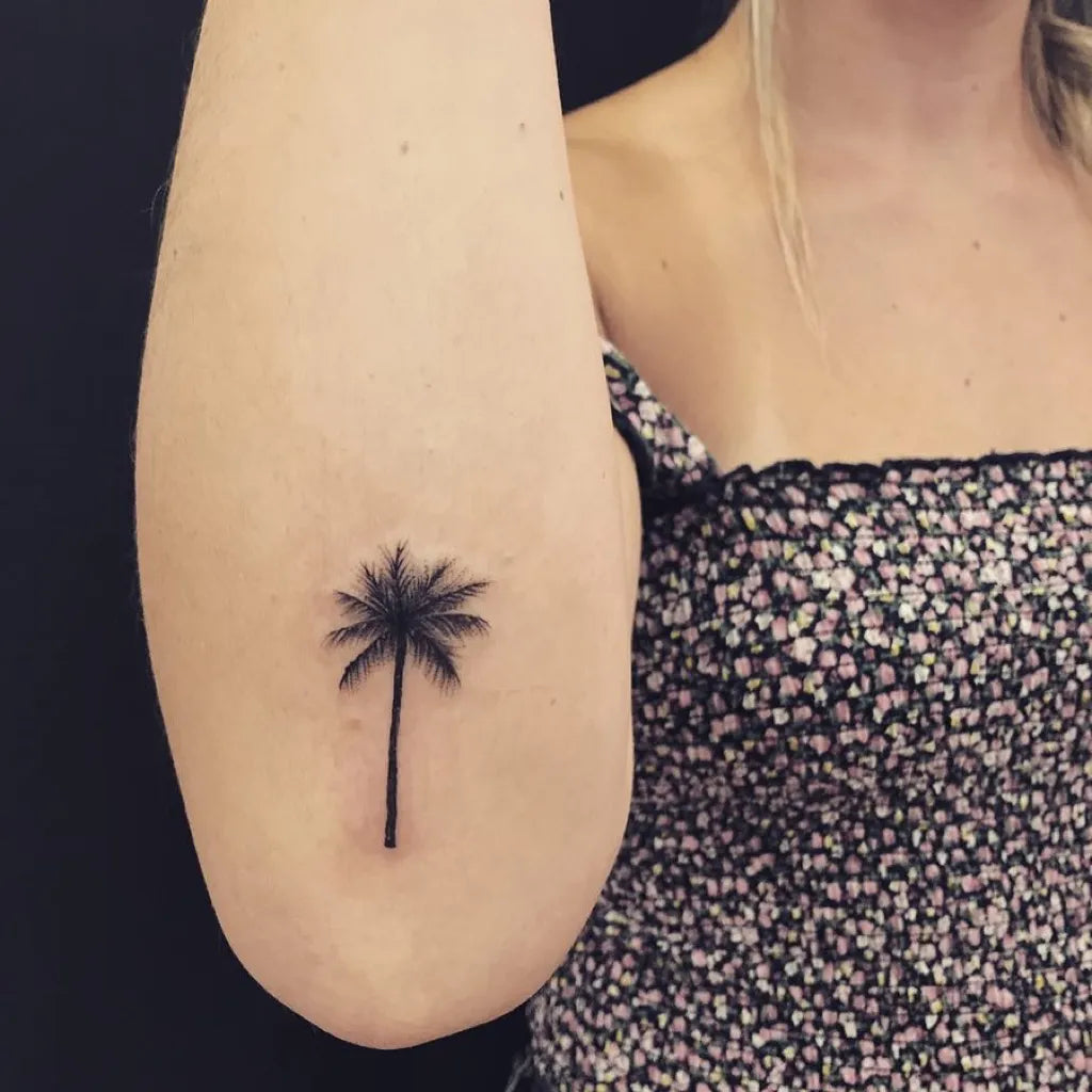 Small Blackwork Palm Tree Tattoo on Women Arm by @bondiink666