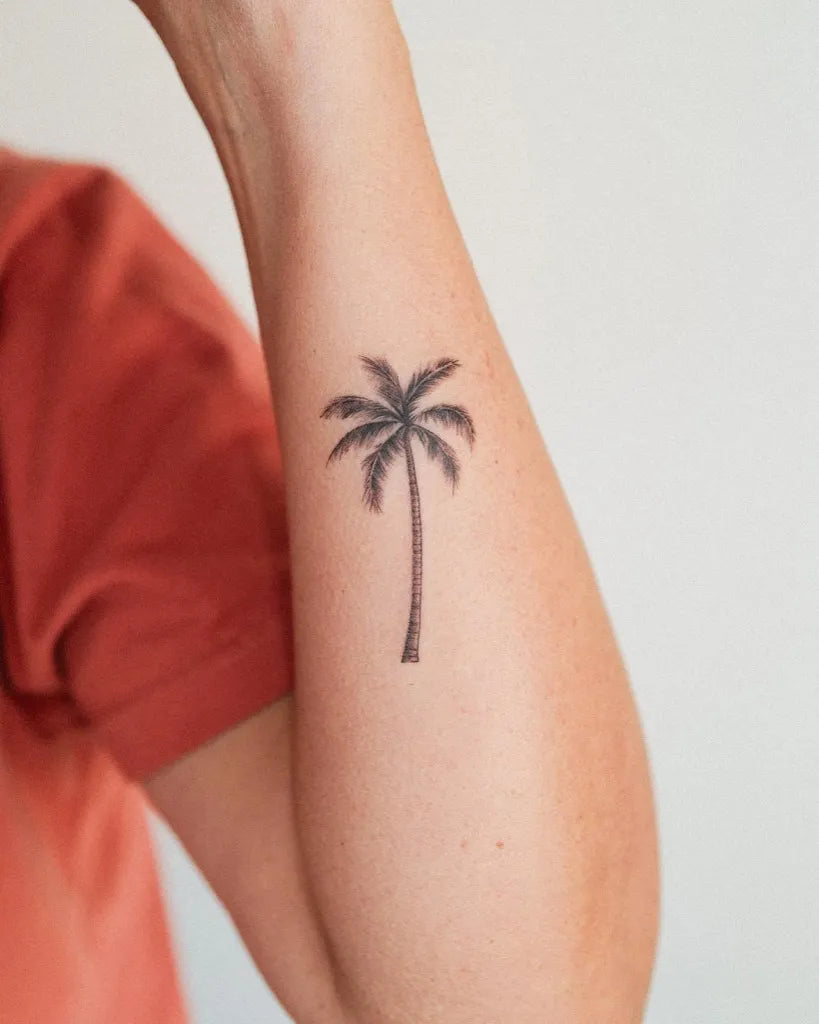 Small Minimalist Palm Tree Tattoo on Women Arm by @the.tinyvegan