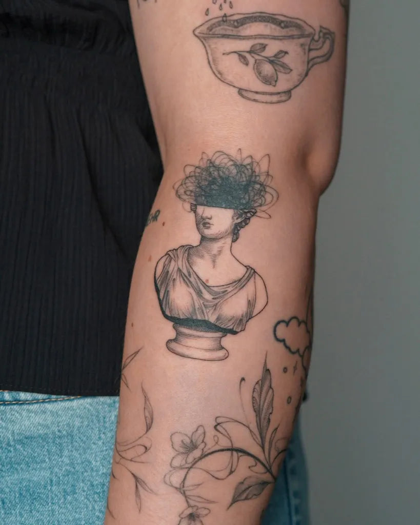 Big Patchwork Bust with Teacup and Flowers on Women Arm Tattoo by @nurburgink