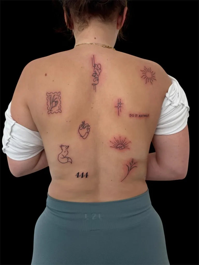Big Patchwork Heart Cross Sun on Women Back Tattoo by @ehose_tattoo
