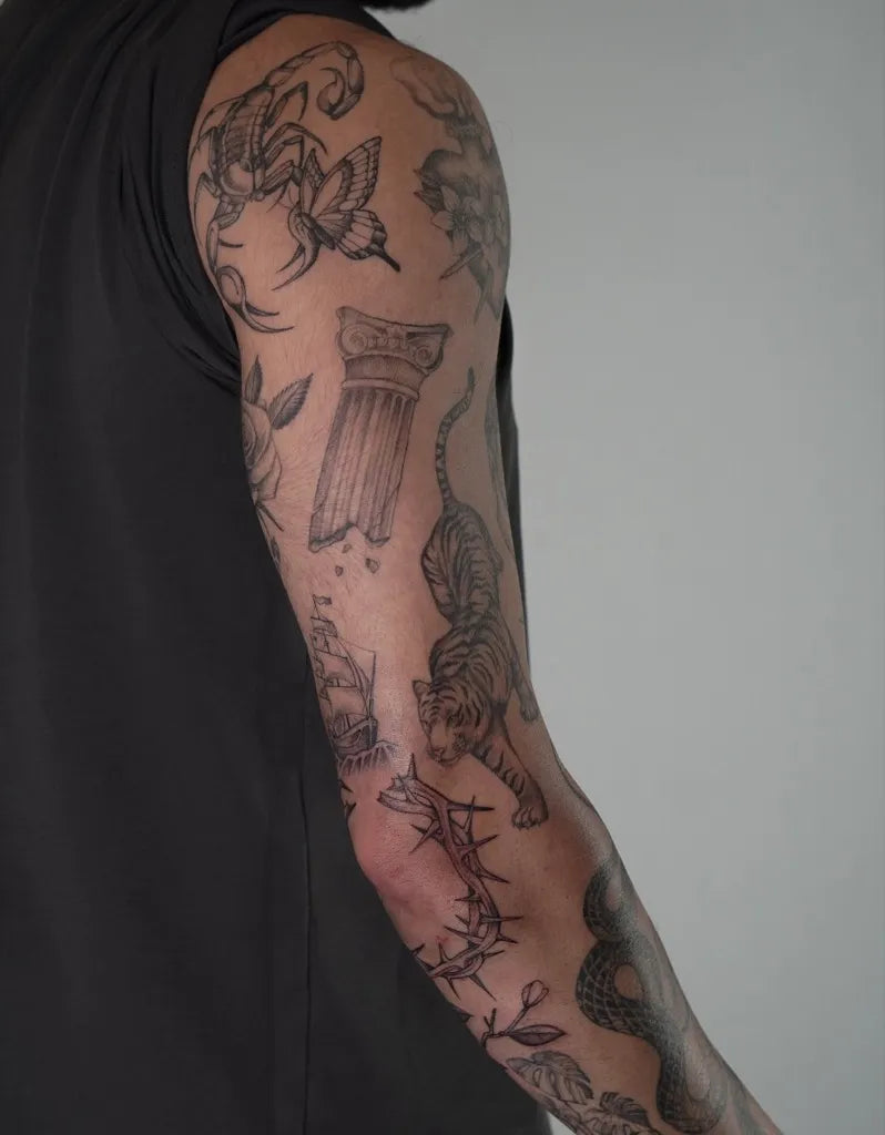 Big Patchwork Scorpion Tiger Greek Column on Men Arm Tattoo by @caventattoo