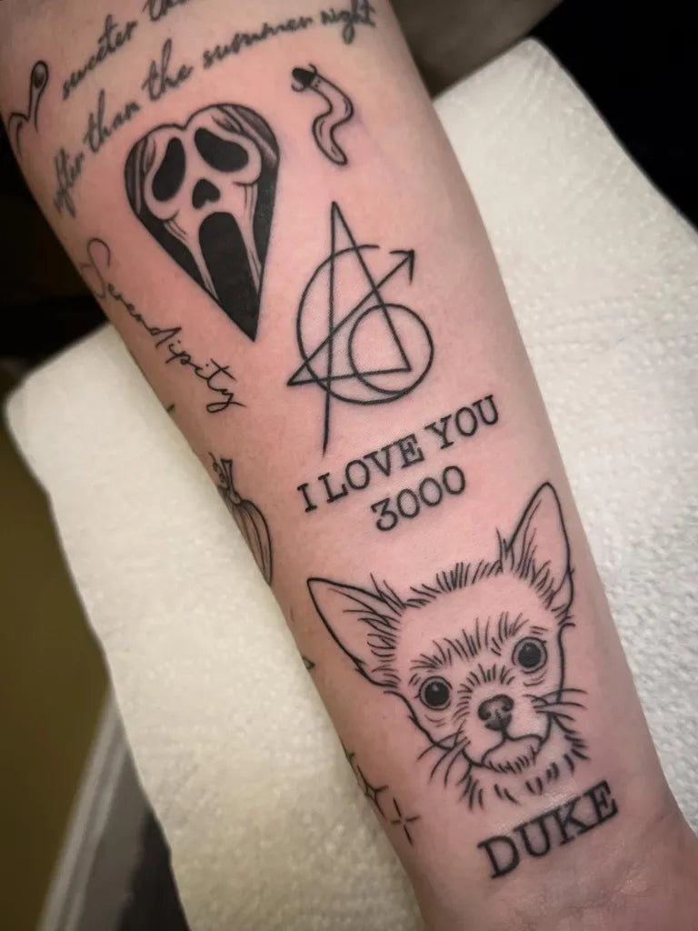 Big Patchwork Scream Heart Avengers Symbol Chihuahua Portrait on Women Arm Tattoo by @l.t.g.tattoos