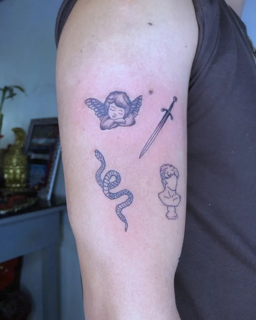 Small Patchwork Angel Sword Snake Bust on Men Arm Tattoo by @aybantatu