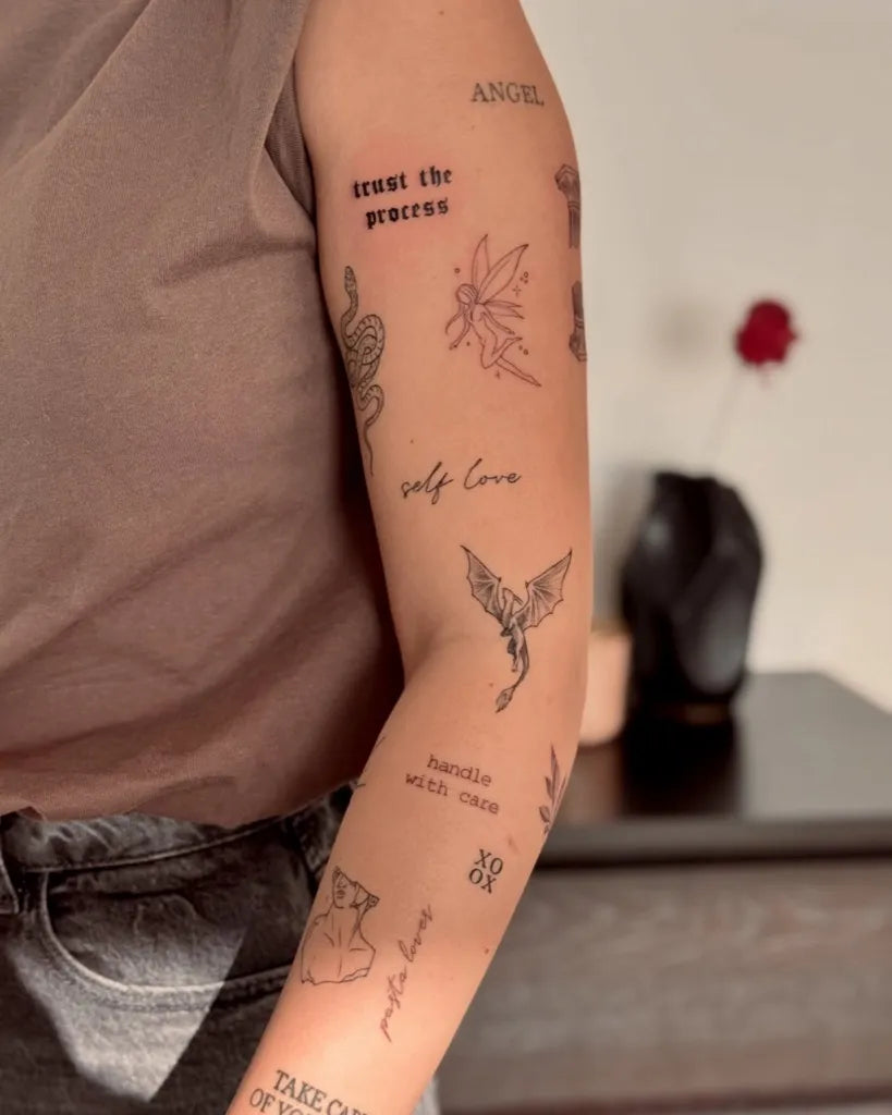 Small Patchwork Butterfly Snake Text on Women Arm Tattoo by @paulinaa.tattoo