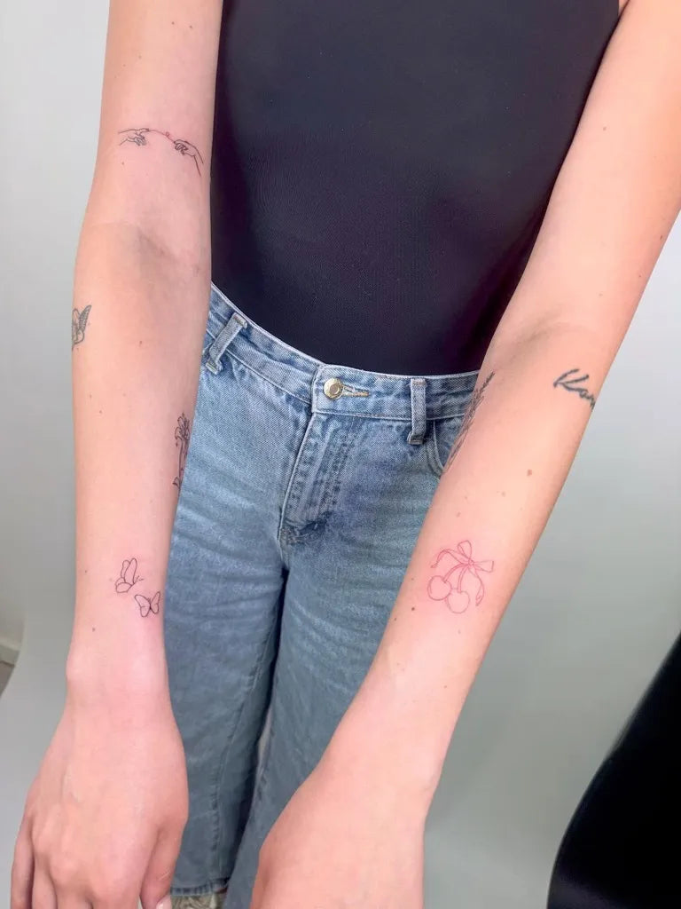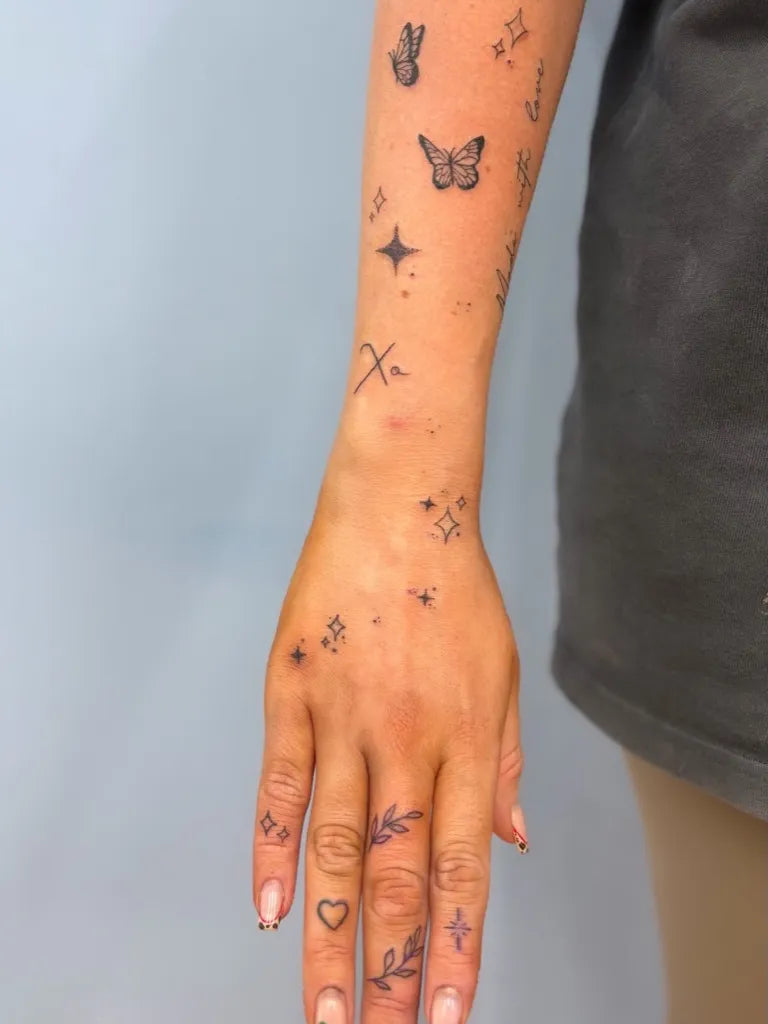 Small Patchwork Butterflies stars crosses on Women Arm Tattoo by @amieelizabeth_tattoos
