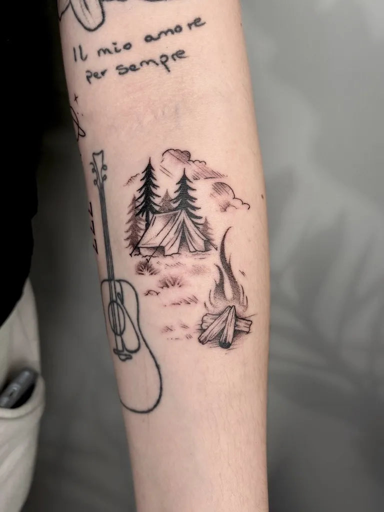 Small Patchwork Camping Guitar Italian Text on Women Arm Tattoo by @alicerosetattoo
