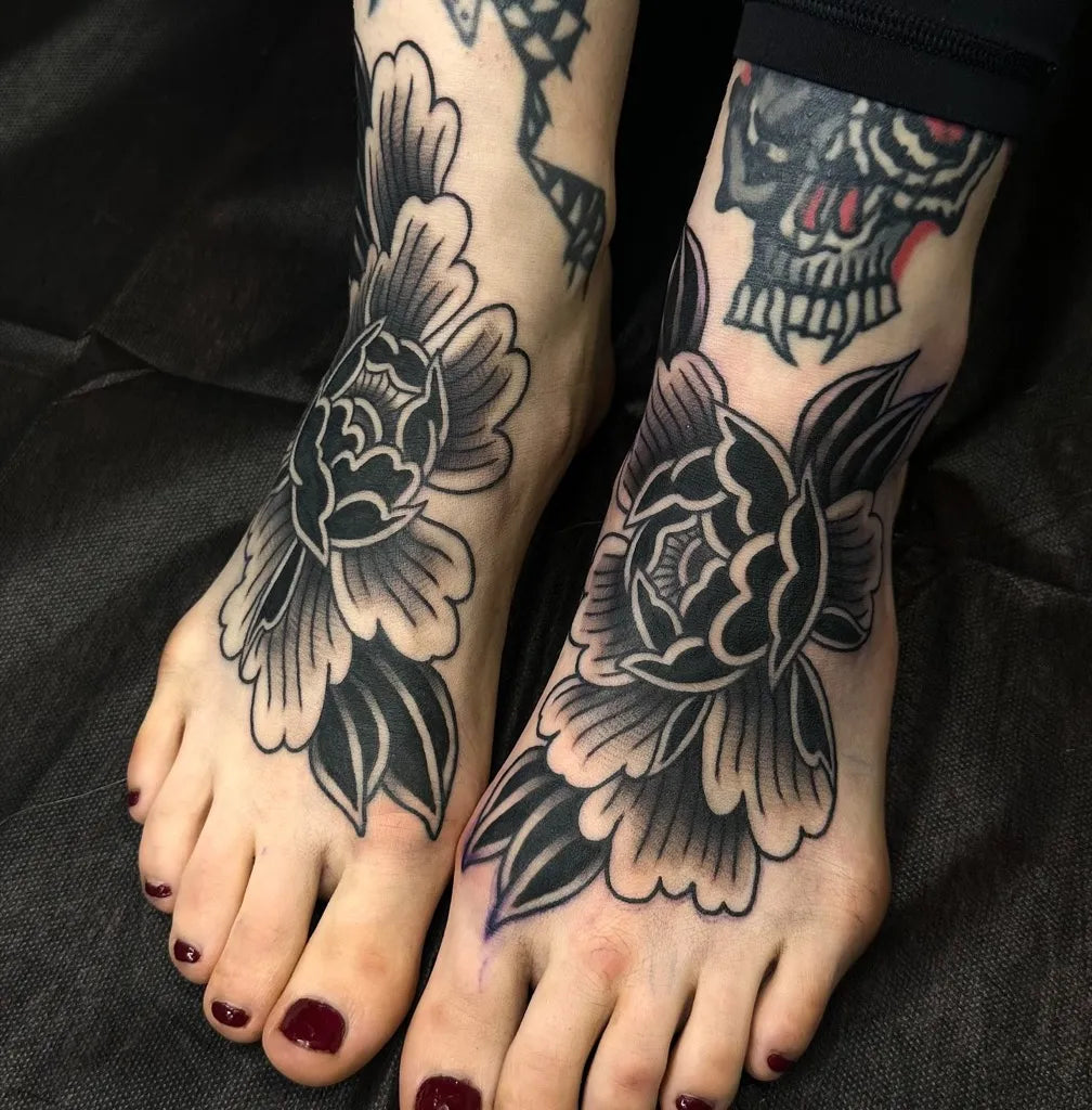 Big Blackwork Peony Skull and Flowers on Women Feet Tattoo by @hamtown.tattoo
