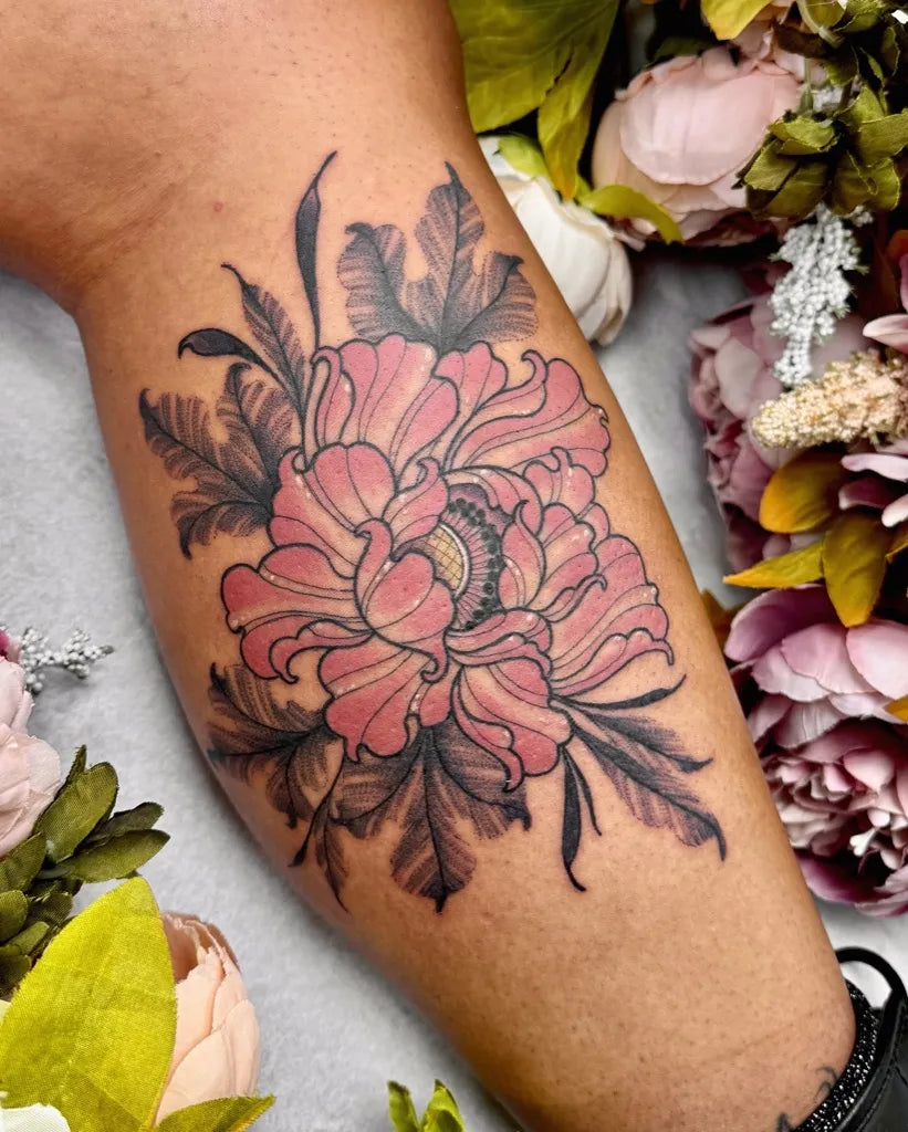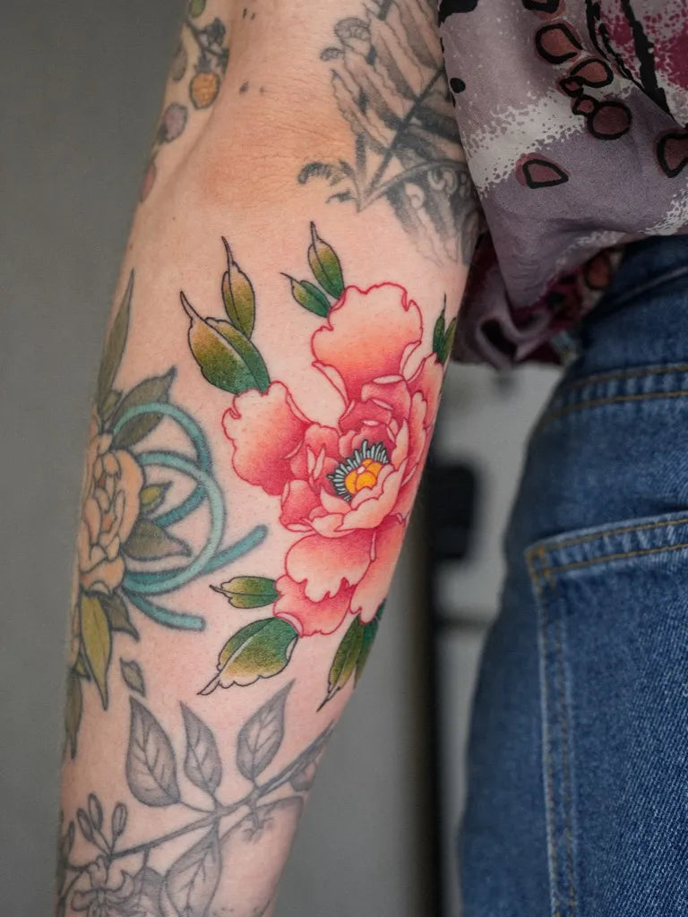 Medium Neo Traditional Peony with Leaves on Women Arm Tattoo by @dustinstemen
