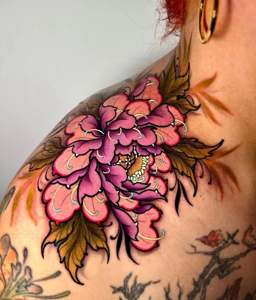 Big Japanese Peony and Leaves on Women Shoulder Tattoo by @labeltattoo