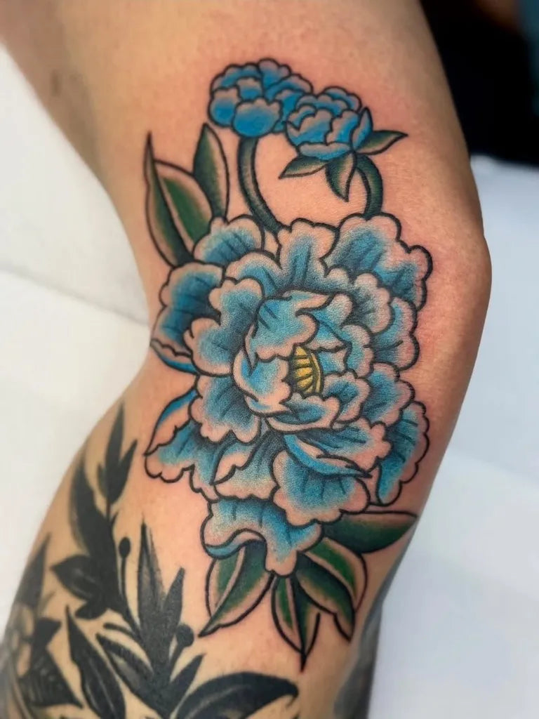 Medium American Traditional Blue Peony and Leaves on Women Knee Tattoo by @surelynottattoo