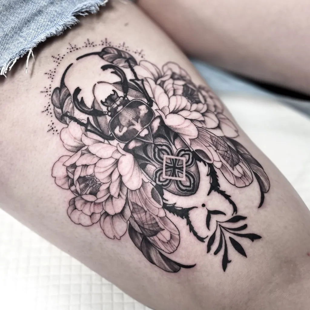 Big Black and Grey Peony Stag Beetle on Women Thigh Tattoo by @chelsea_tattooart