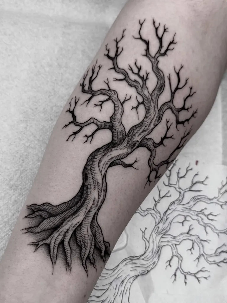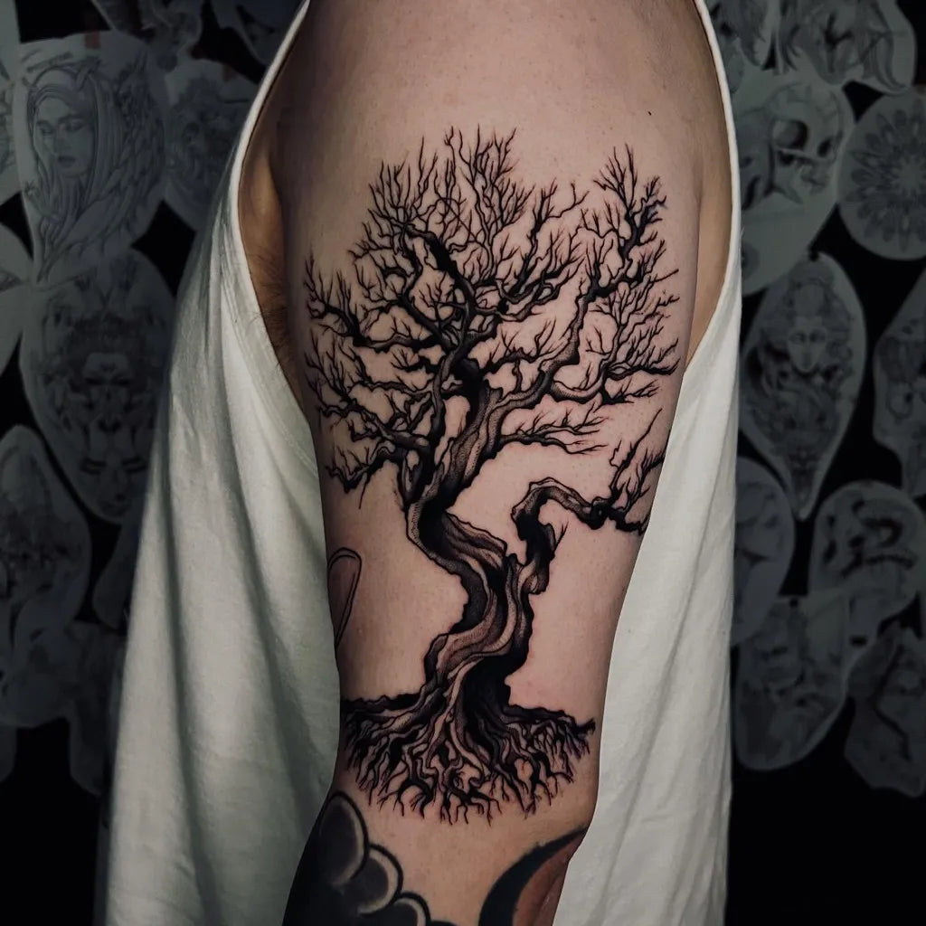 Big Black and Grey Poison Tree with Roots and Branches on Men Arm Tattoo by @skunxinx