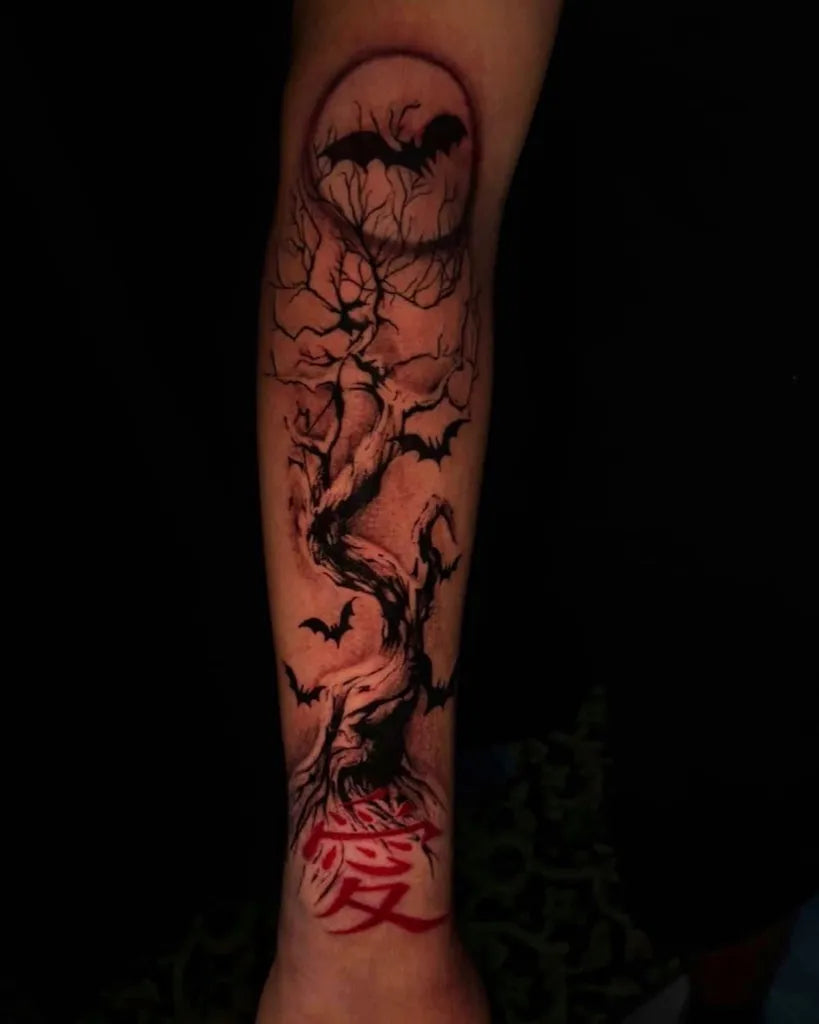 Big Black and Grey Poison Tree with Bats on Men Arm Tattoo by @immersiveink
