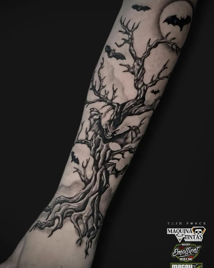 Big Black and Grey Poison Tree with Bats and Moon on Men Arm Tattoo by @tajhponce